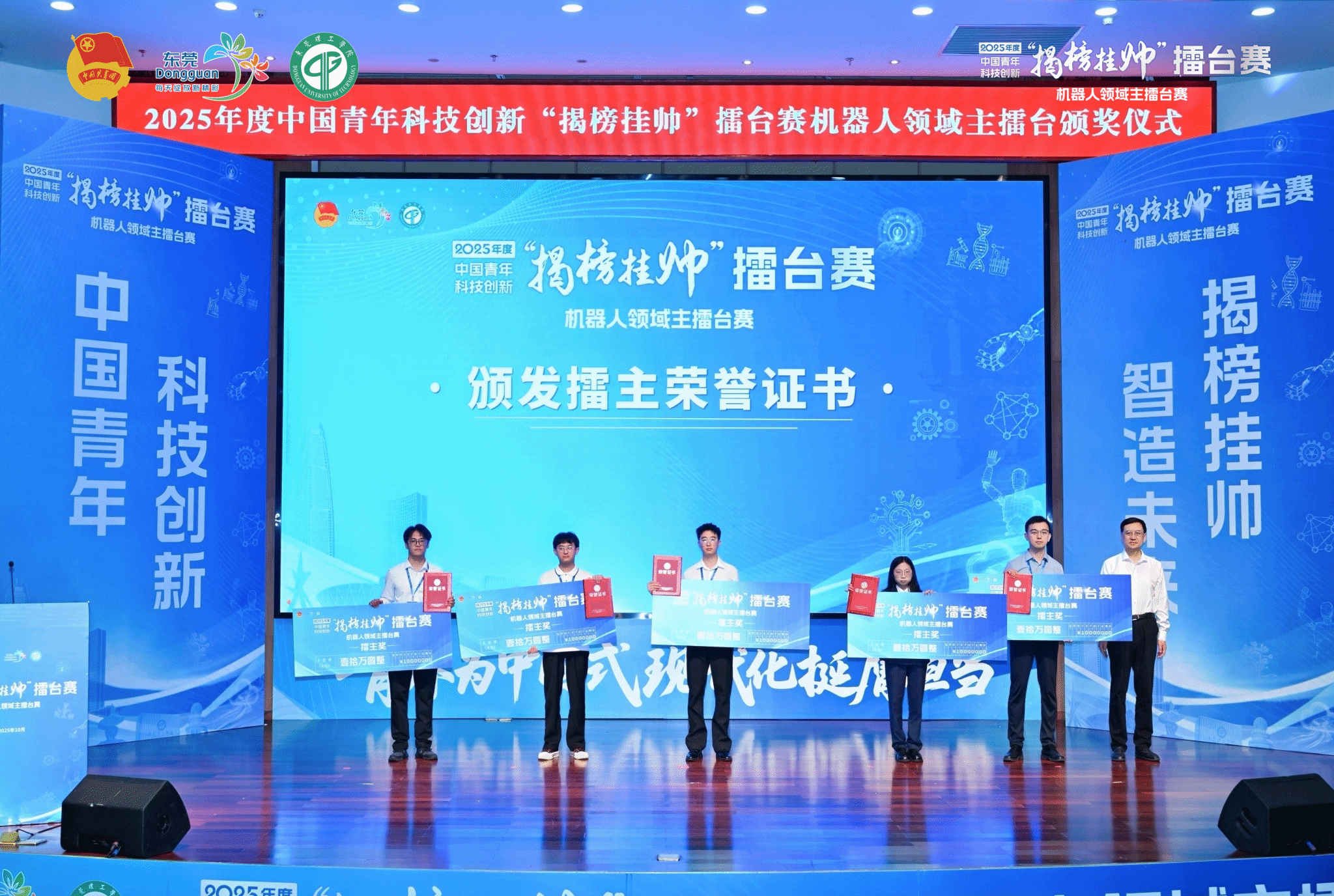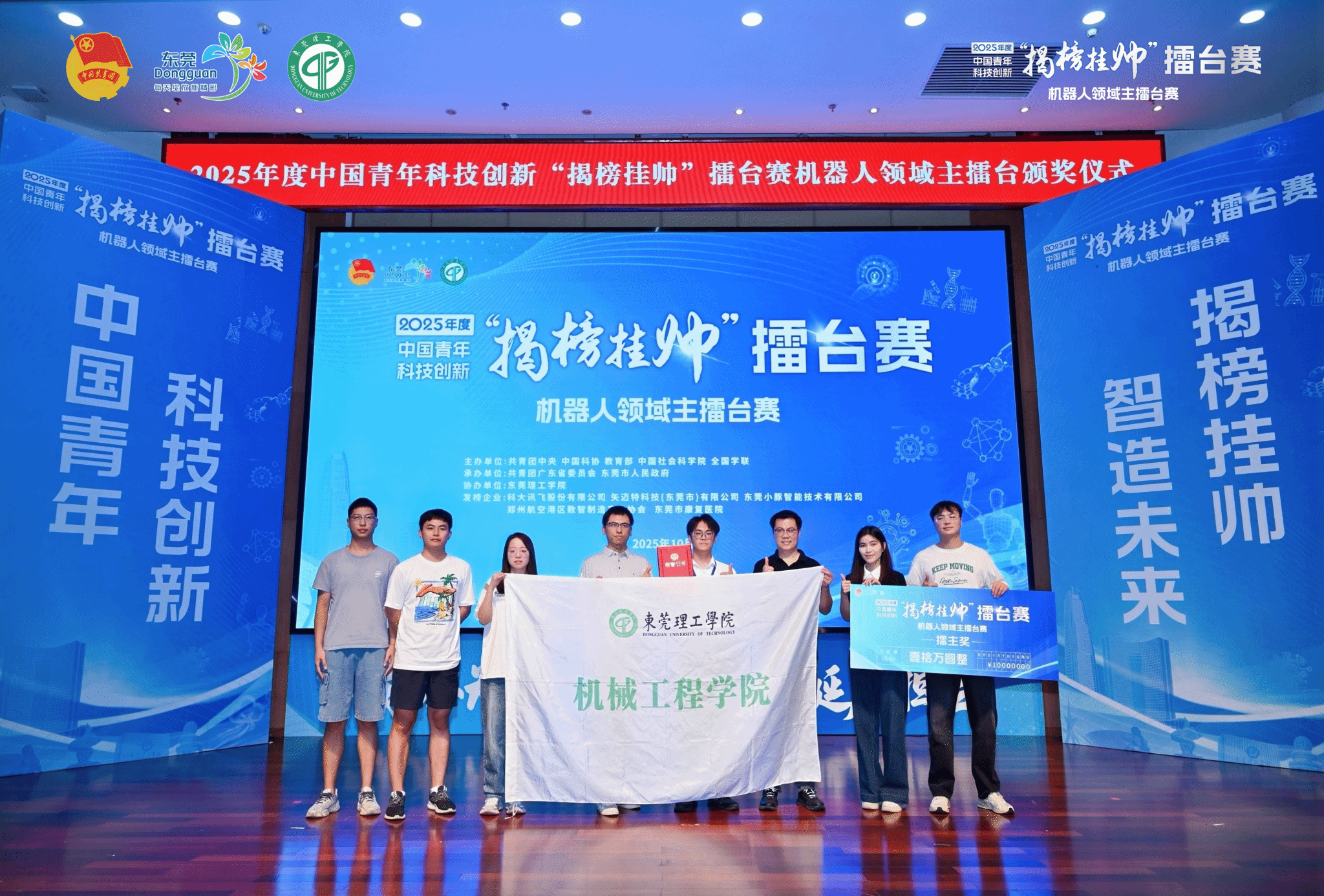 2025年10月10日-12日,2025年度中国青年科技创新“揭榜挂帅”擂台赛“机器人领域”终审擂台赛在广东省东莞市成功举办。东莞理工学院机械工程学院参赛项目《双动平台混联踝关节康复机器人》成功入围终审擂台赛,并最终夺得擂主!