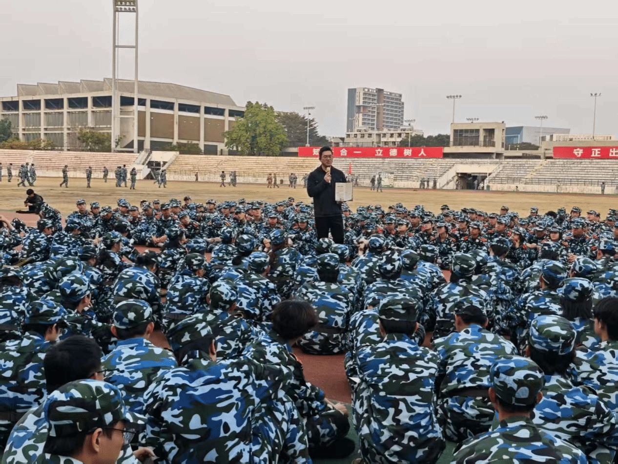 2025级新生军训开训的第一天,机械工程学院所在一营连队指导员携带着宣传资料下连队开展征兵宣传活动,为刚踏入大学校门的新生们上国防教育第一课。