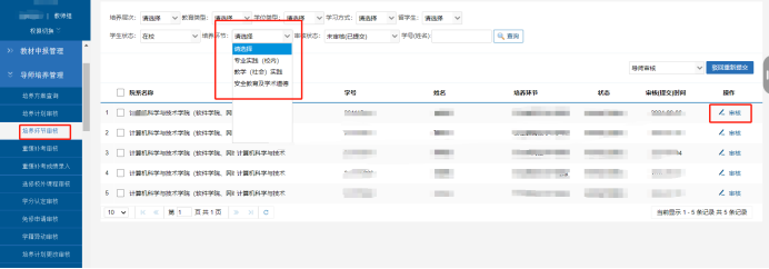 (2)导师登录研究生教育教学管理系统,选择【导师培养管理】-【培养环节审核】-培养环节选择安全教育及学术道德-【点击审核】-【填写审核意见】-【确定】。