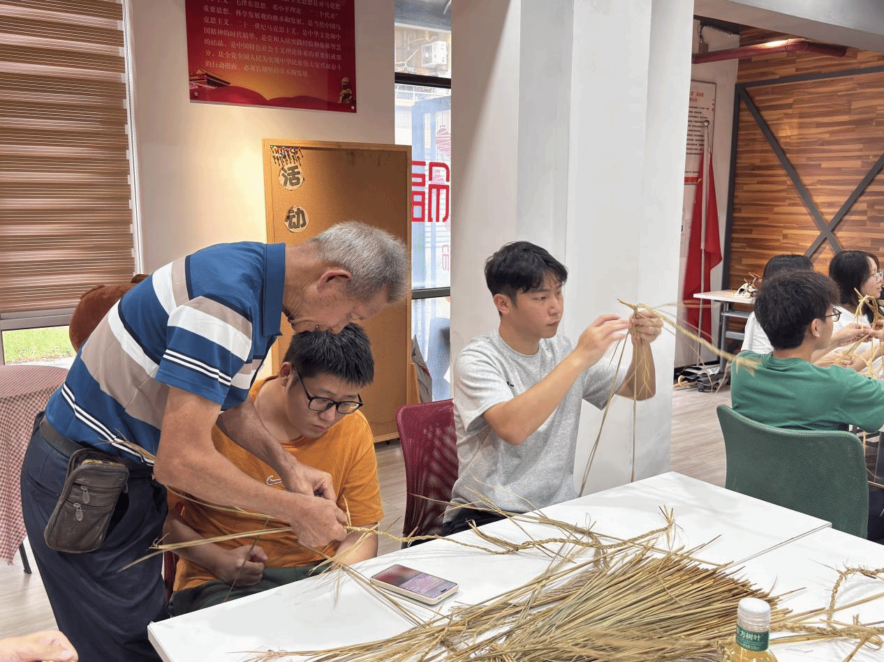 在草龙扎制技艺教学环节,叶淑华老师亲自示范,从挑选材料开始,向学生党员们展示草龙扎制的每一个步骤。她介绍道,草龙的制作材料主要是稻草,这些看似普通的稻草,在匠人的手中却能变成栩栩如生的草龙。叶老师熟练地将稻草整理、捆绑,运用交叉、缠绕等技法,逐步勾勒出草龙的轮廓。她一边操作,一边耐心地讲解每个步骤的要点和技巧,学生党员们围在周围,目不转睛地观看,不时发出阵阵惊叹。